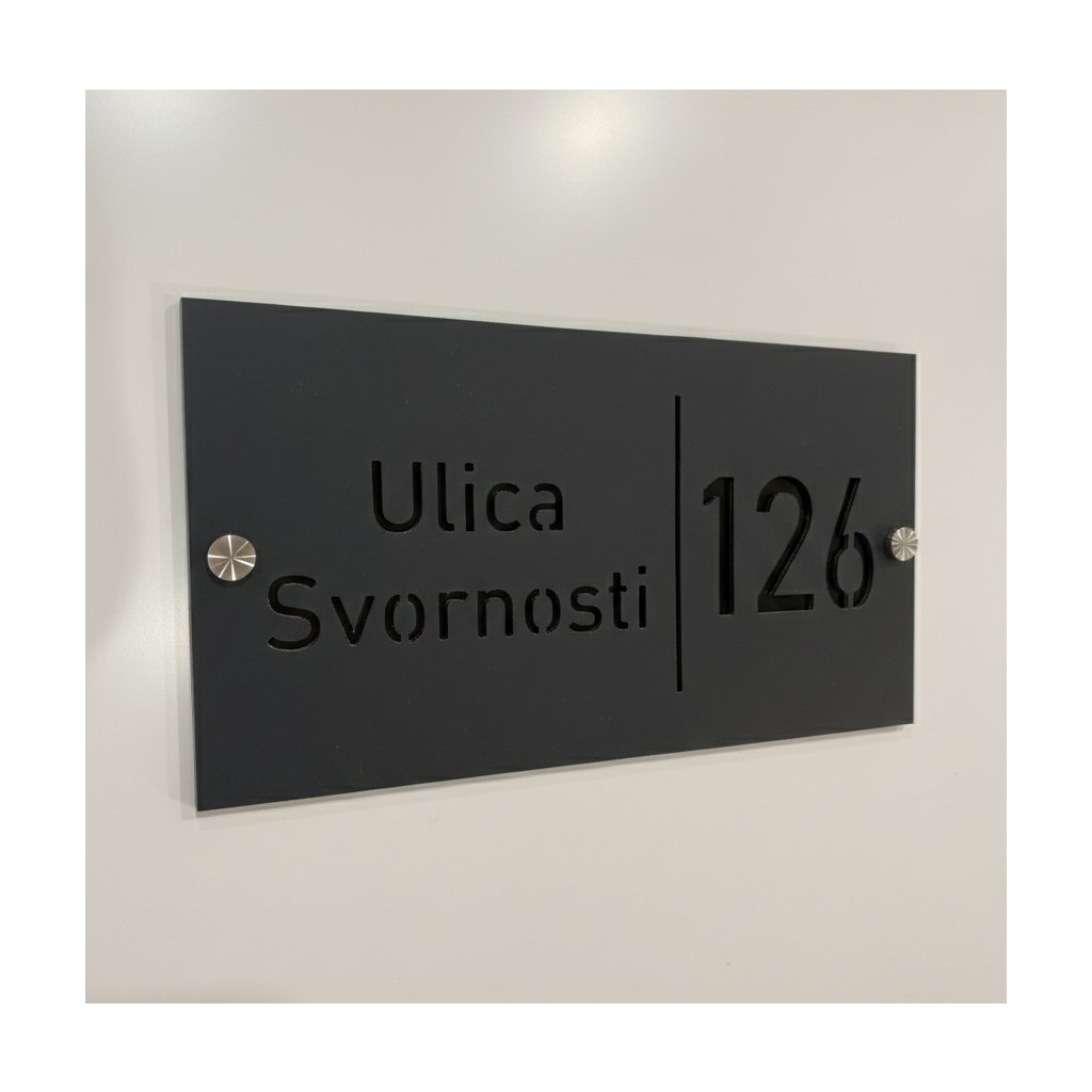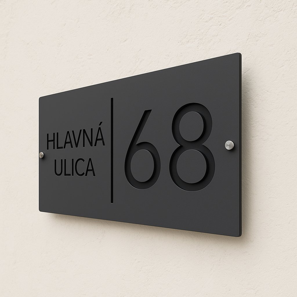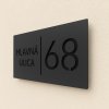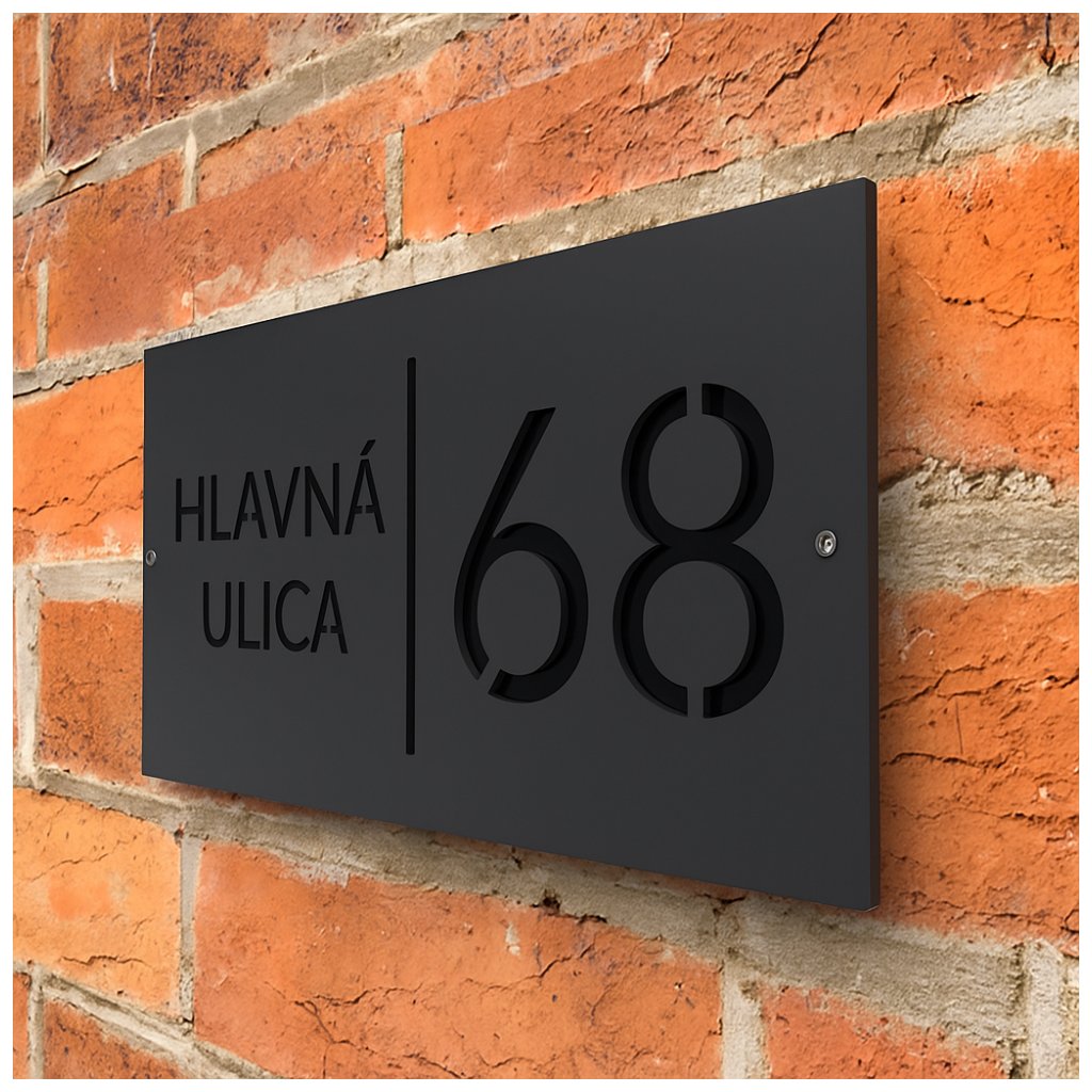 Elegantné domové číslo z hliníkovej zliatiny v antracitovej farbe, horizontálne rozdelenie názvu ulice a čísla.