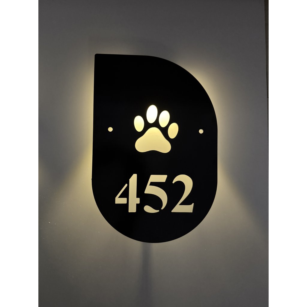Kvapkové domové číslo so stopou labky a s integrovaným solárnym LED osvetlením.