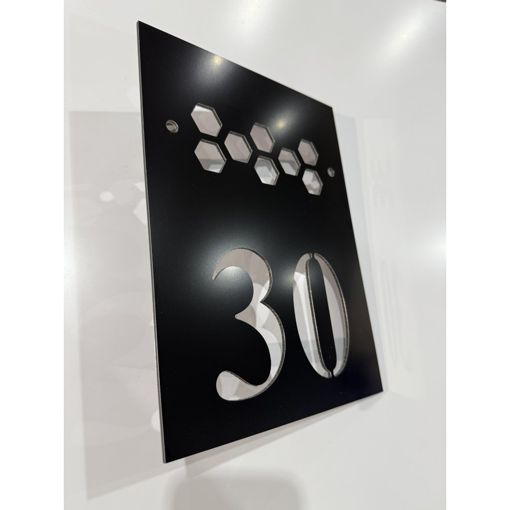 Domové číslo s integrovaným solárnym LED osvetlením. Dekorácia: včelie plásty