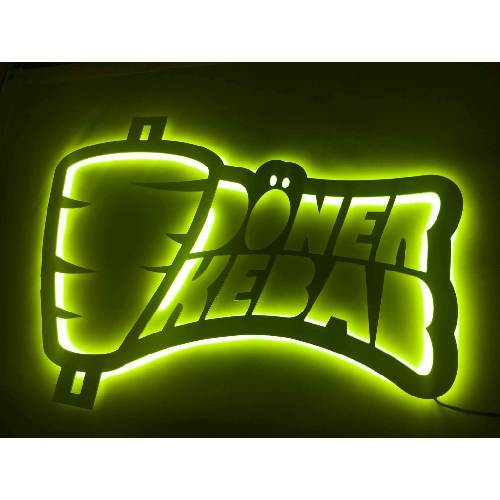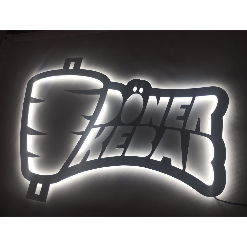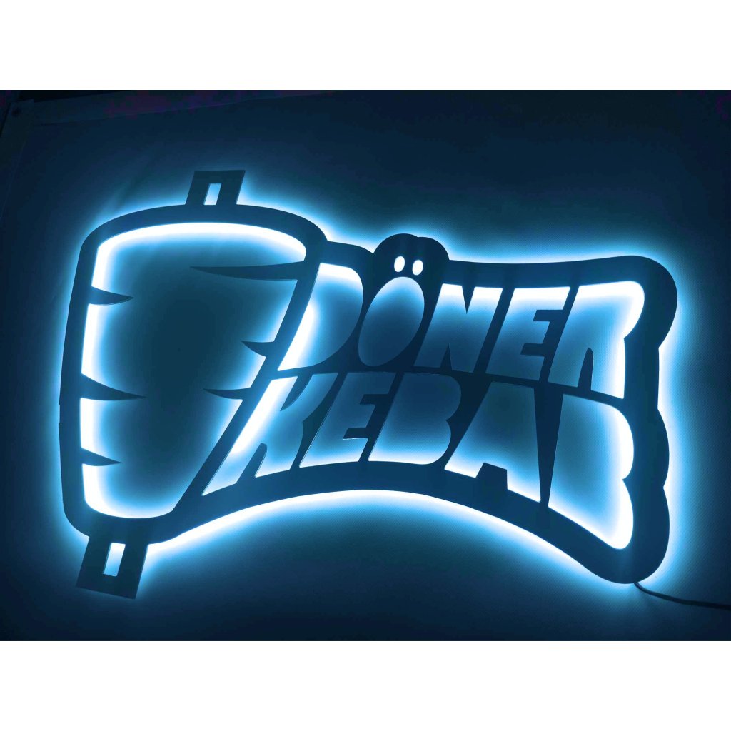 Moderná reklamná tabuľa s ikonickým motívom kebabu a nápisom „DÖNER KEBAB“, vybavená výrazným bielym LED podsvietením pre maximálnu viditeľnosť.
