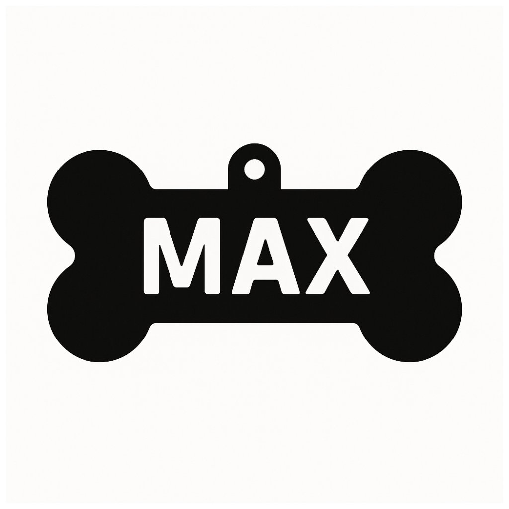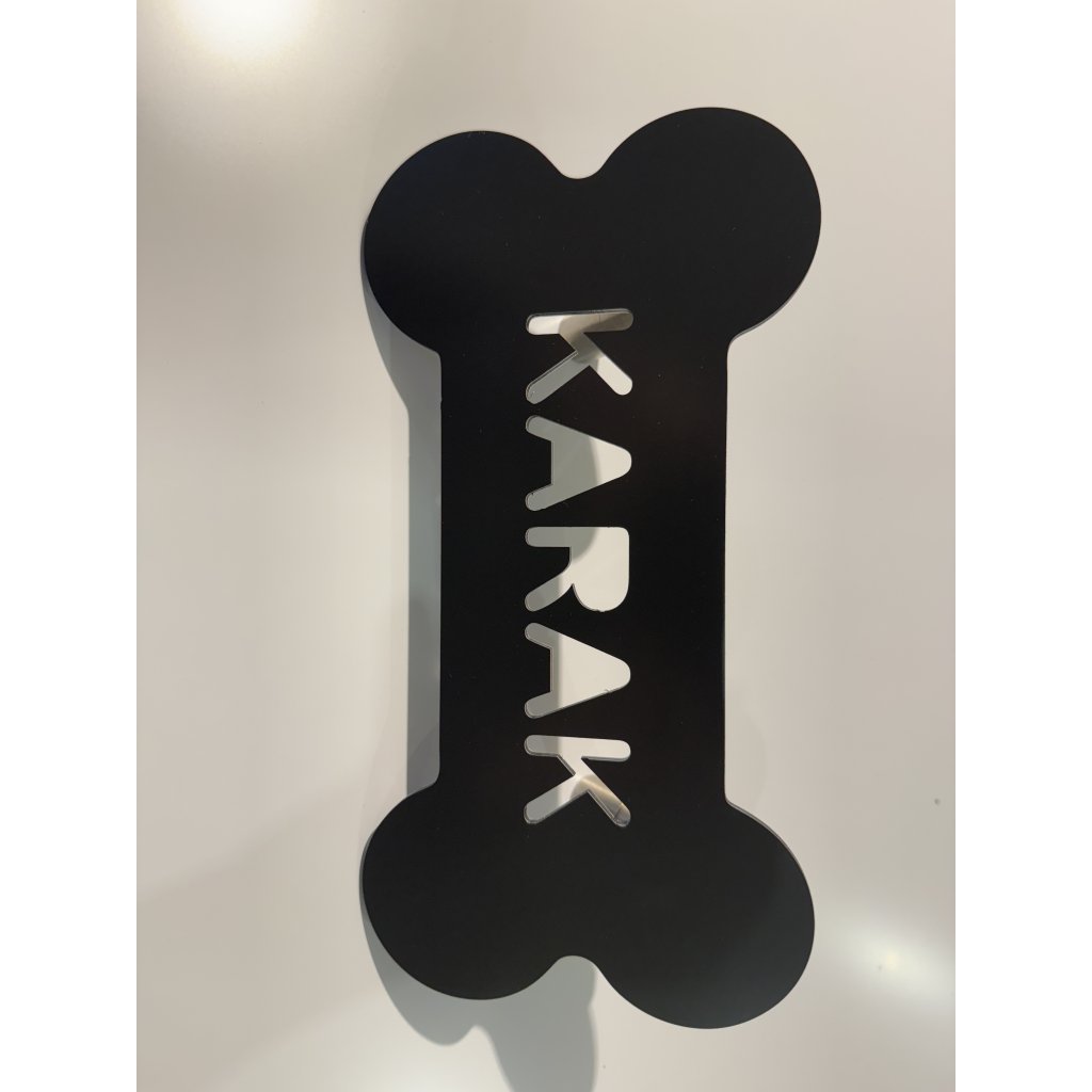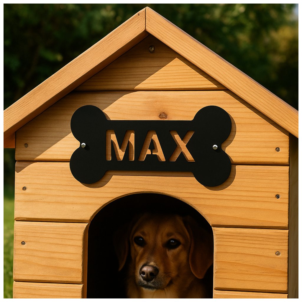 Štýlová menovka v tvare kosti s vyrezaným menom vášho psíka. Ideálna dekorácia na búdu, plot alebo dvere.