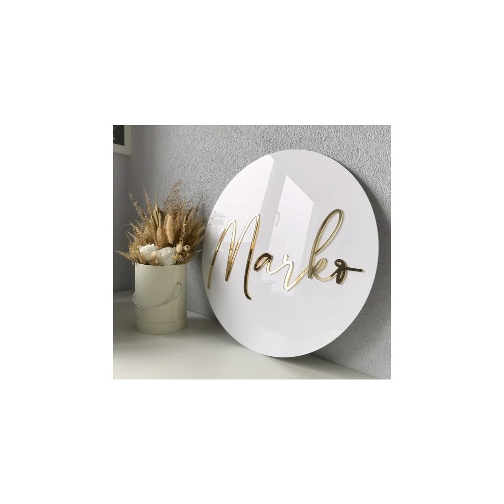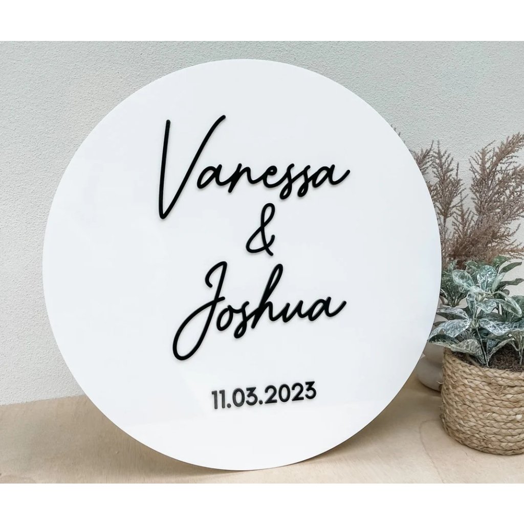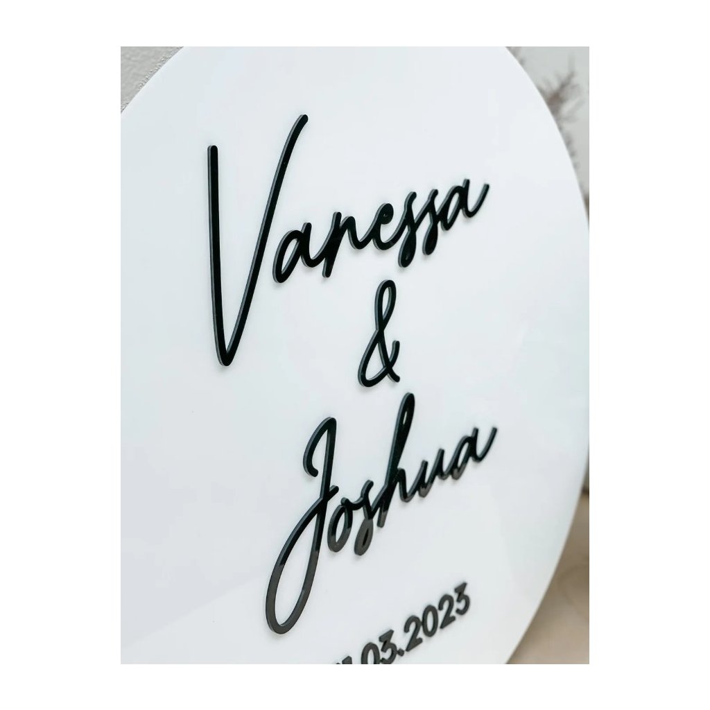 Táto moderná svadobná dekorácia je vyrobená z bieleho plexiskla s elegantným 3D nápisom z čierneho (alebo zvoleného) plexi. Mená a dátum svadby (vlastný text) sú vyrezané z 3 mm hrubého plexiskla, ktoré vytvára decentný priestorový efekt a profesionálny dojem.