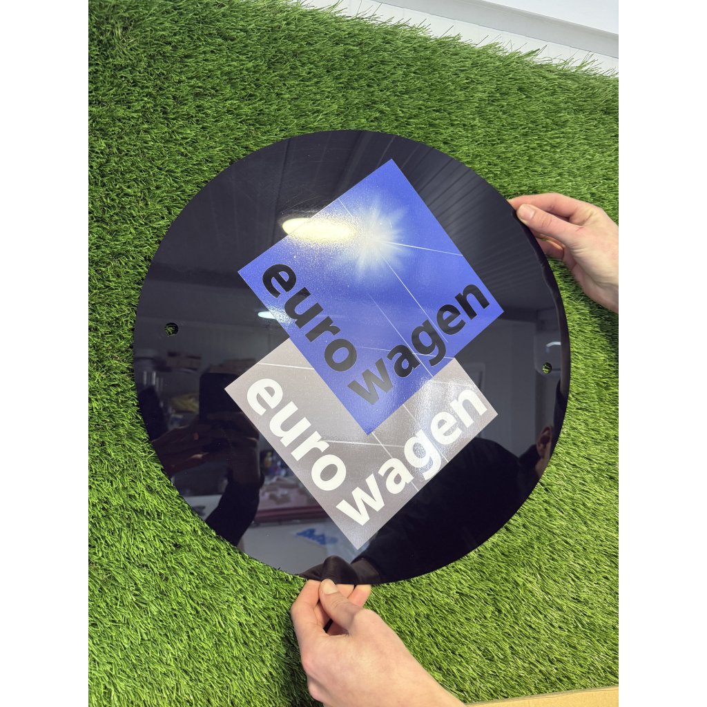 Tento nesvietiaci čierny plexi kruh s nalepeným 3D logom je elegantné a cenovo dostupné riešenie pre reprezentatívnu prezentáciu značky.