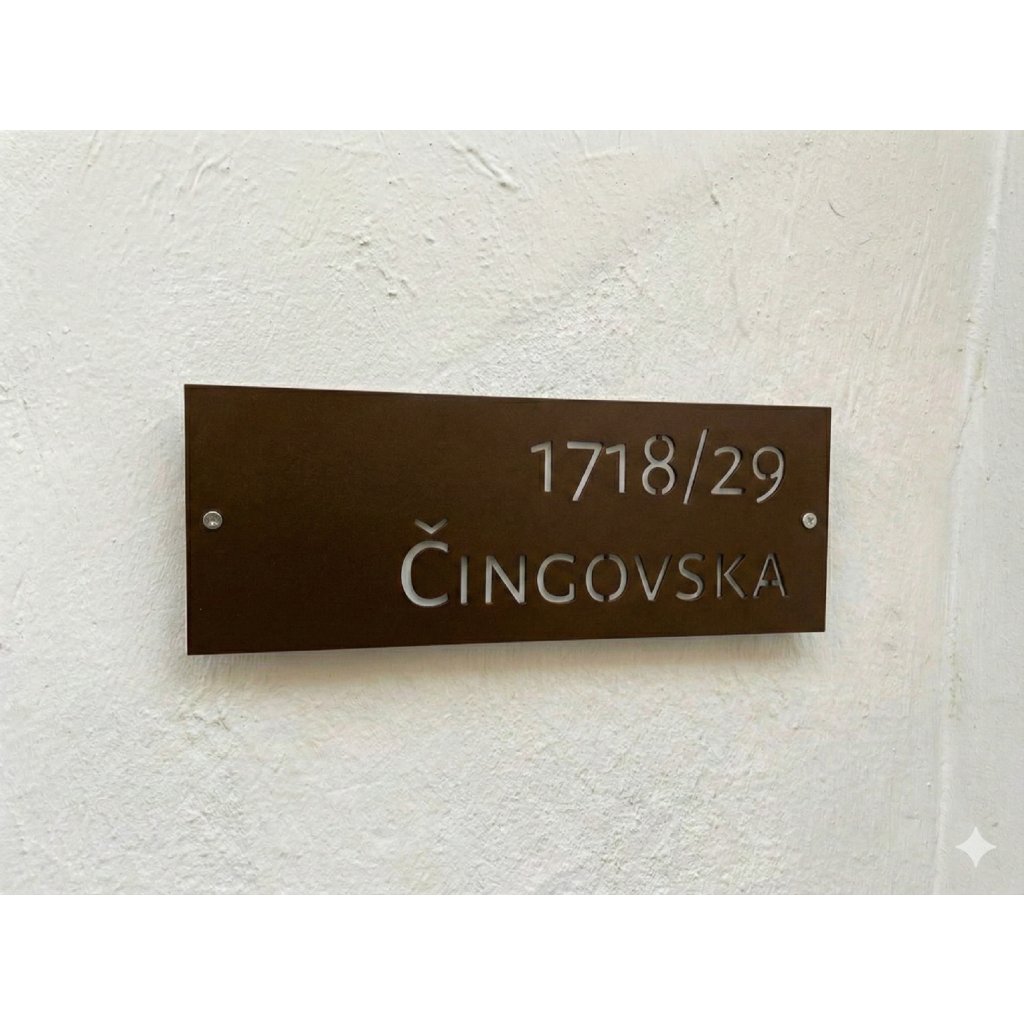 Do poznámky pri objednávke uveďte požadované označenie: názov ulice a číslo domu. Môžete zadať aj kombináciu znakov či písmen, napríklad 125/2a. Výroba trvá približne 1 až 2 pracovné dni. Produkt je vhodný pre rodinné domy, chaty, apartmány aj novostavby.