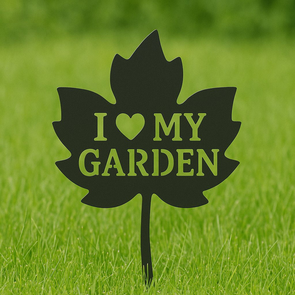Dekoratívna silueta javorového listu s nápisom „I ♥ MY GARDEN“ – zapichovacia ozdoba z dibondu pre každú milovníčku záhrady.