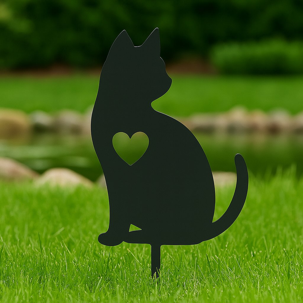 Roztomilý mačka so srdiečkom, vyrezaný z dibondu – jednoducho zapichnete do zeme ako dekoráciu.
